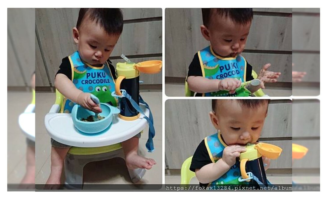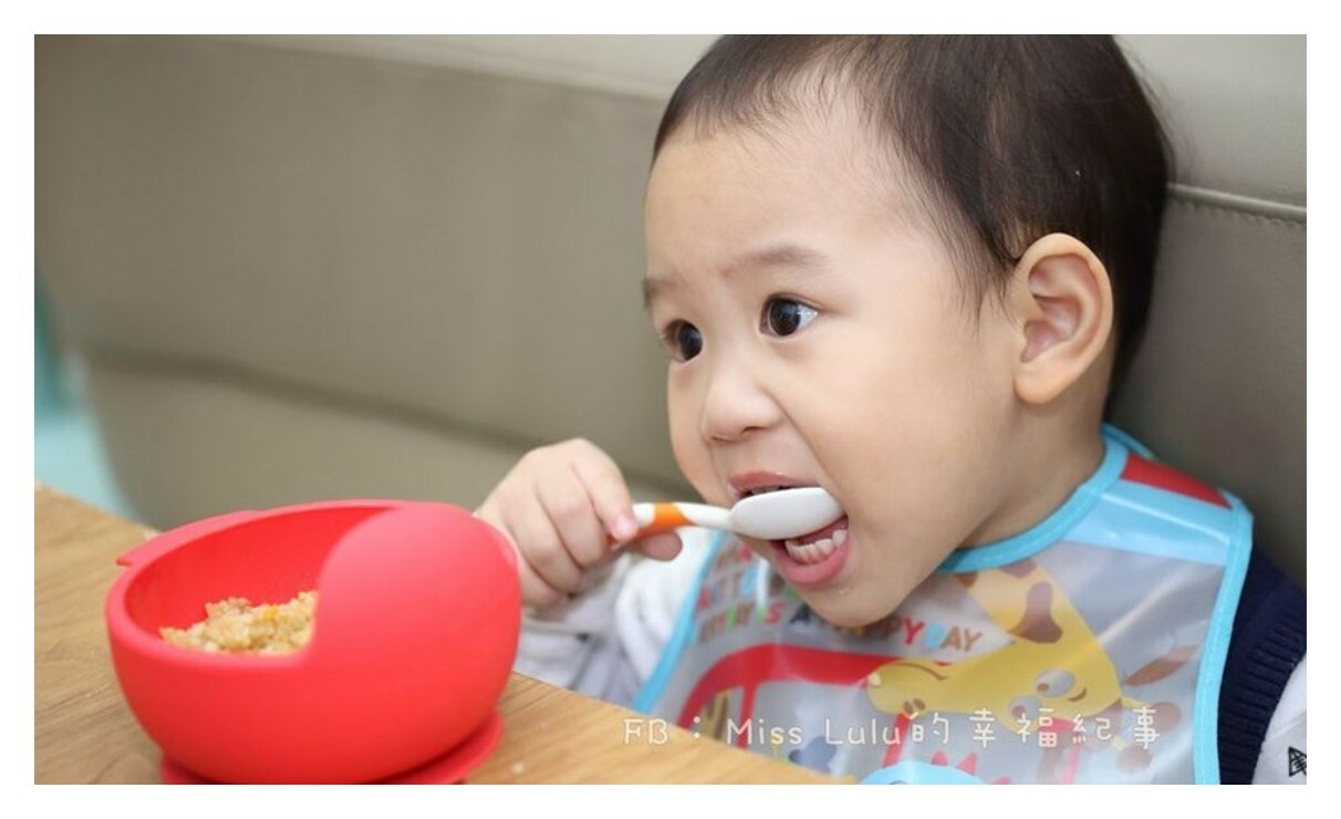 昕王子1Y2M,我才讓他試著自己拿餐具吃飯,