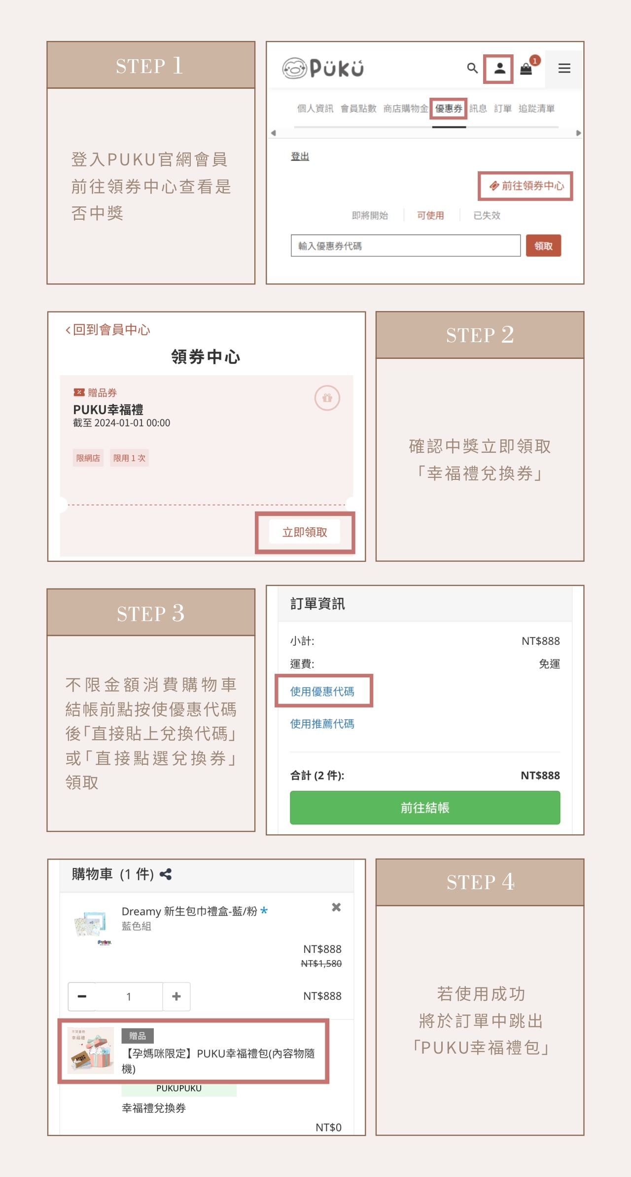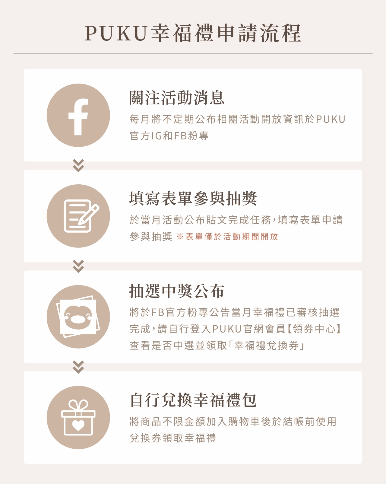 • 兌換方式:請至「PUKU官網」不限金額下單於訂單中使用兌換券領取幸福禮