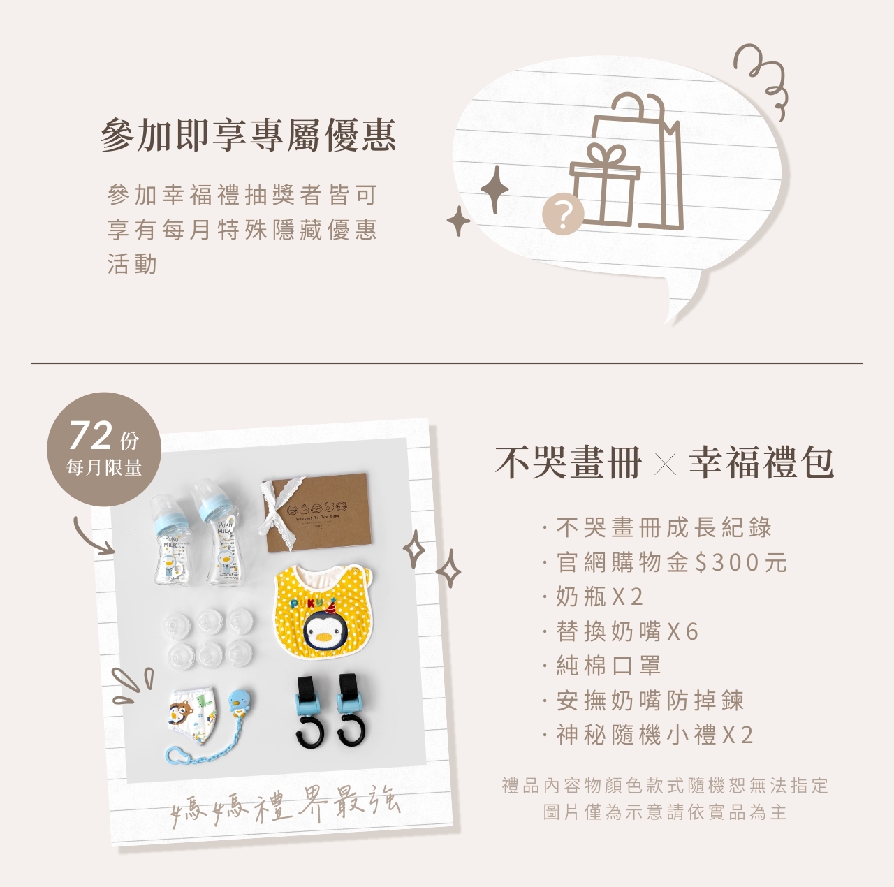 • 獲選通知:於「PUKU官網」發送「不哭畫冊X幸福禮」兌換券乙張至會員帳戶內,兌換券發送時間請留意Facebook粉專貼文