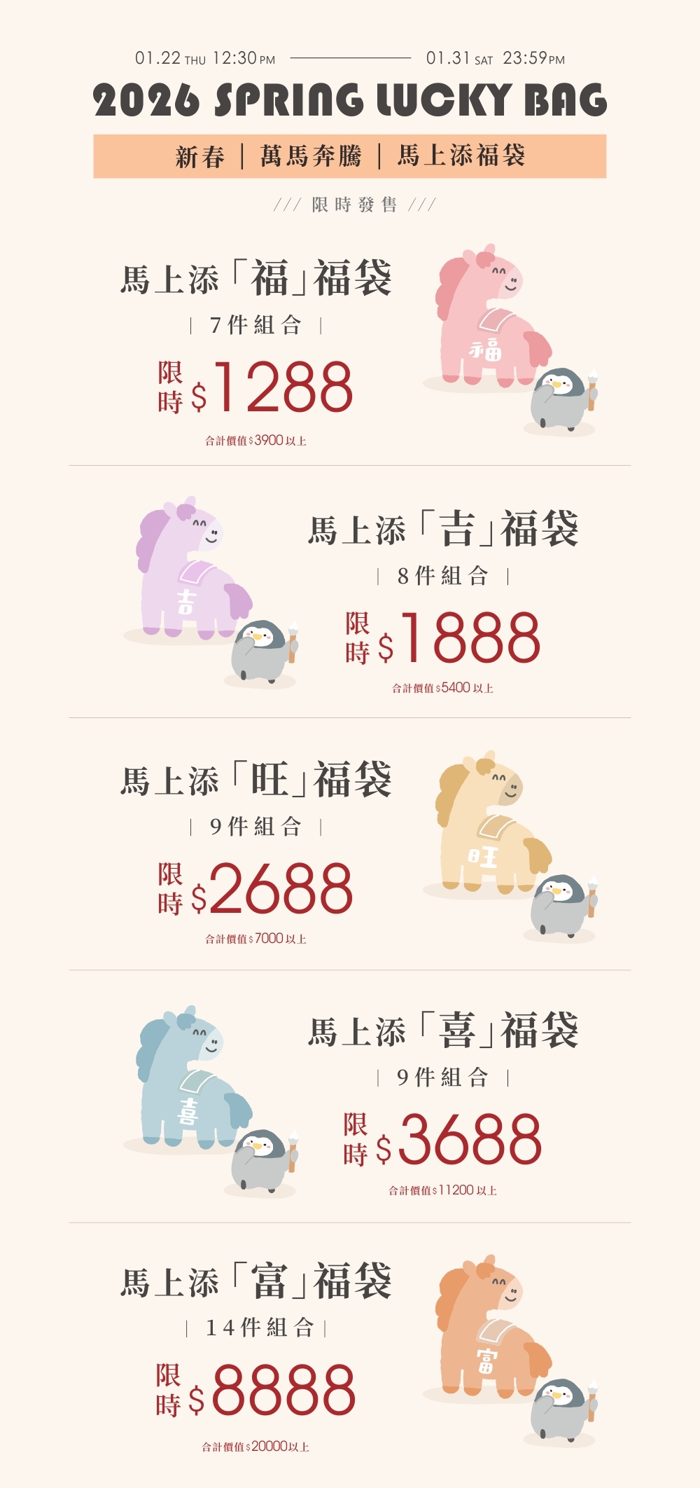 ※新年福袋已為優惠商品,恕不能再使用任何折價券、購物金或參與任何全館滿額贈活動(紅包、春聯贈送活動除外)。