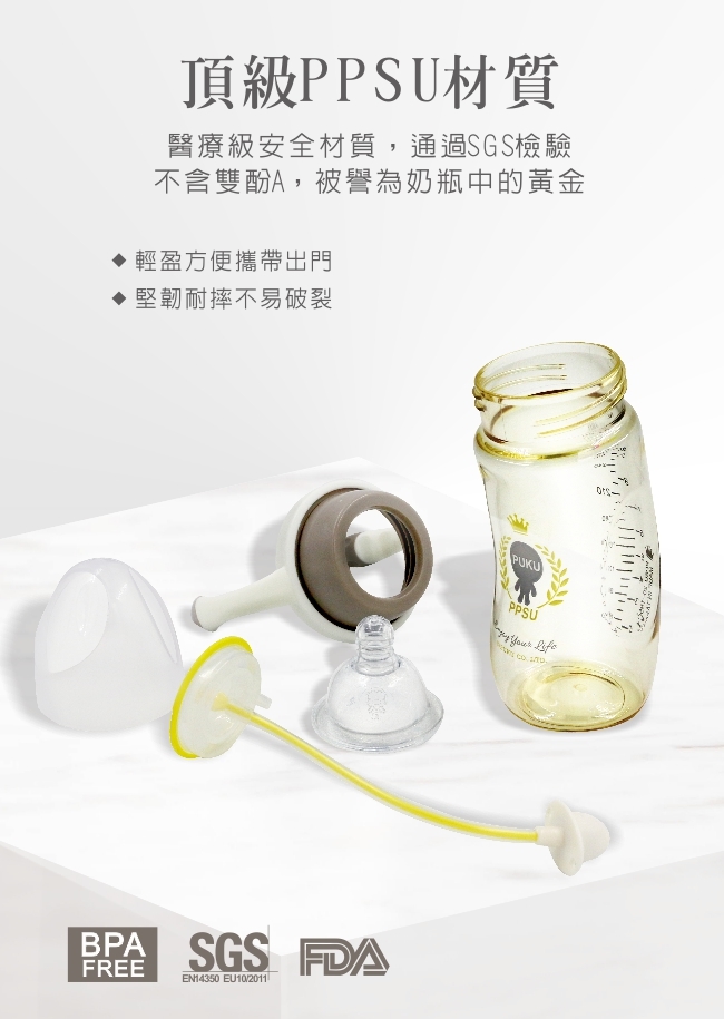 商品材質:奶瓶:聚亞苯基PPSU,奶嘴:矽膠,瓶蓋/螺旋蓋:PP
