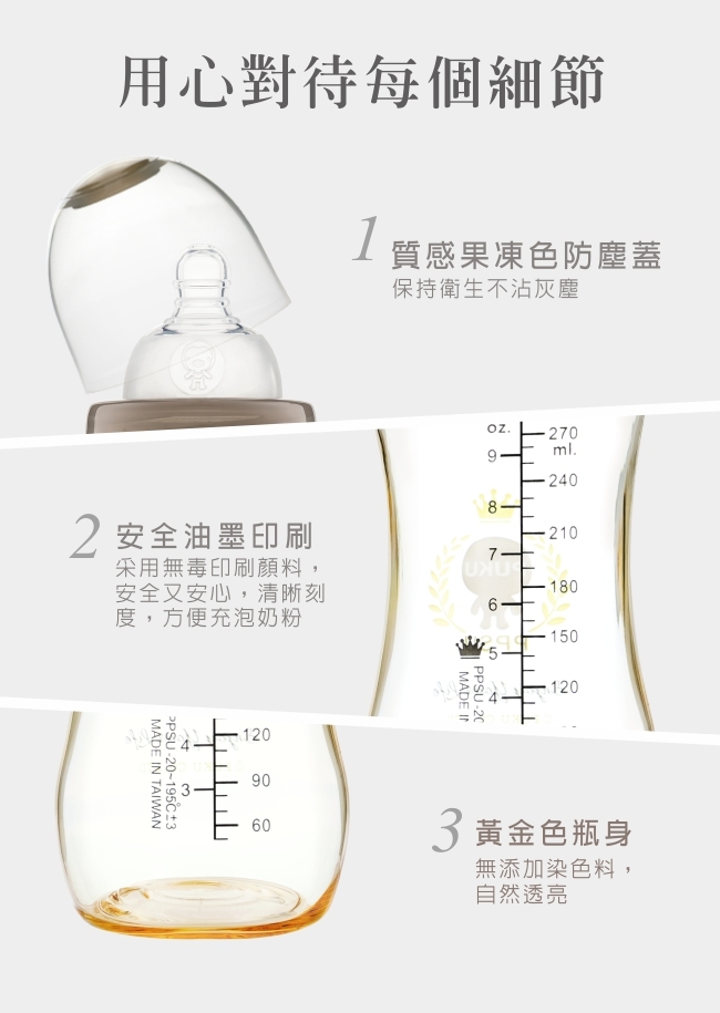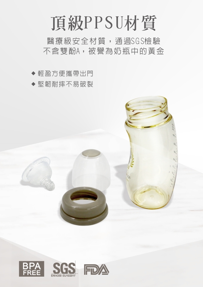商品材質:奶瓶:聚亞苯基PPSU,奶嘴:矽膠,瓶蓋/螺旋蓋:PP