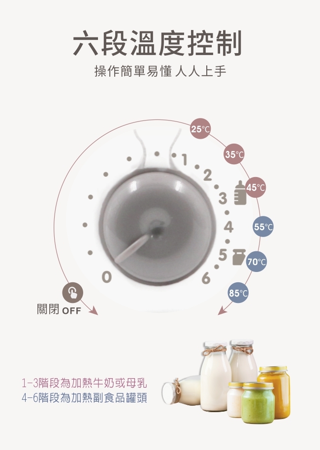 六段式溫度控制:1~3階段為加熱牛奶或母乳,4~6階段為加熱副食品或罐頭