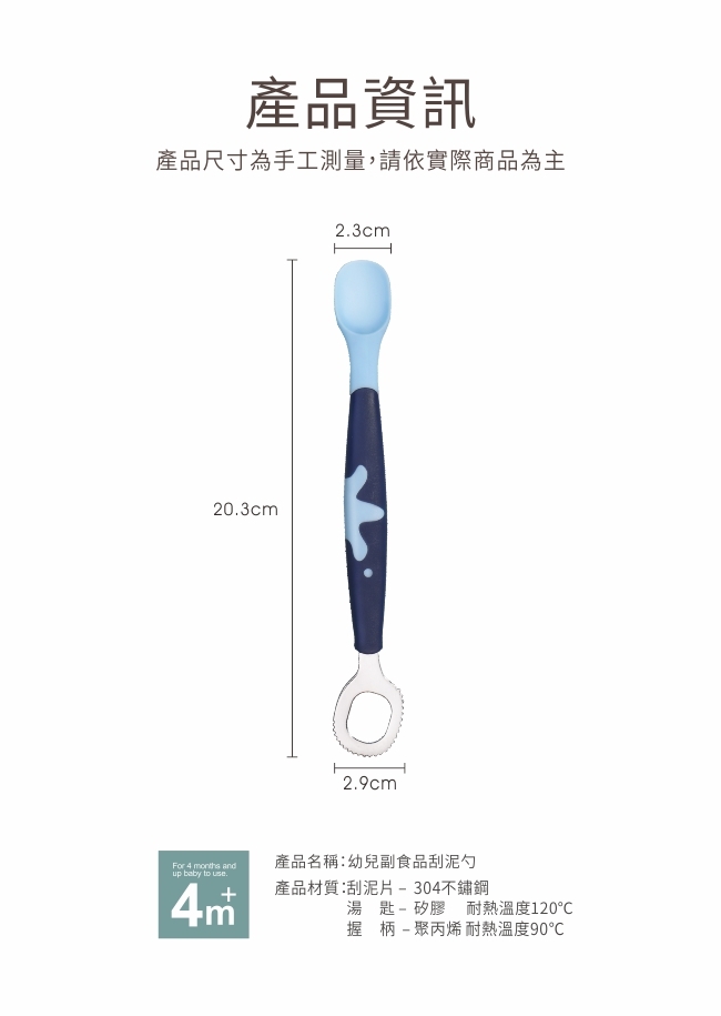 商品材質:勺頭-矽膠、刮泥片-304不鏽鋼、握柄-聚丙烯