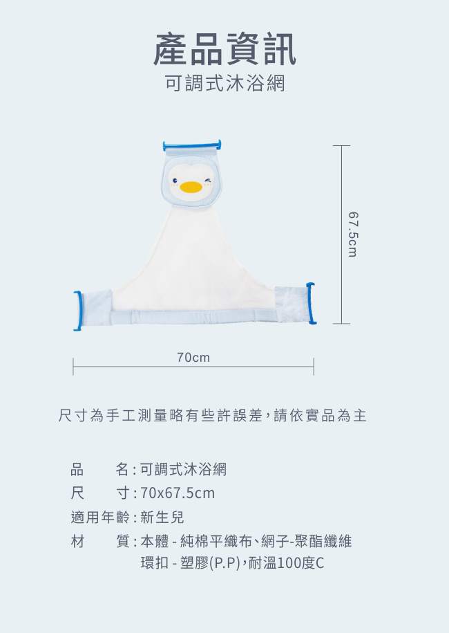 適用年齡:新生兒 顏色:水色 商品產地:台灣 注意事項: 圖片僅供參考,商品依原廠實際供貨樣式為準。 |