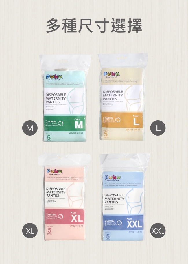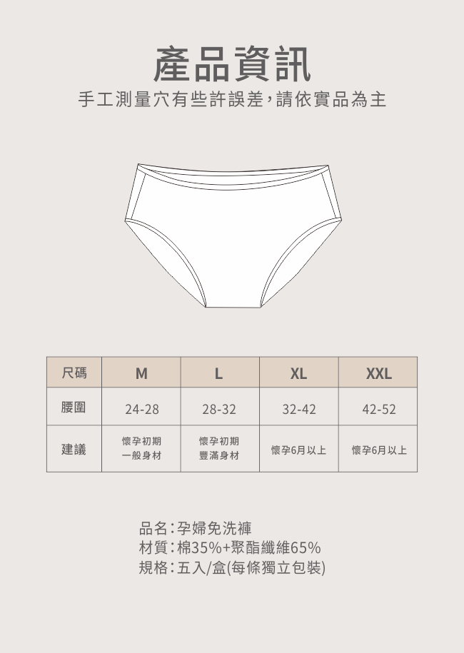 商品品名:孕婦免洗褲5入-M/L/XL/XXL 商品型號:P17807/P17808 商品特點: