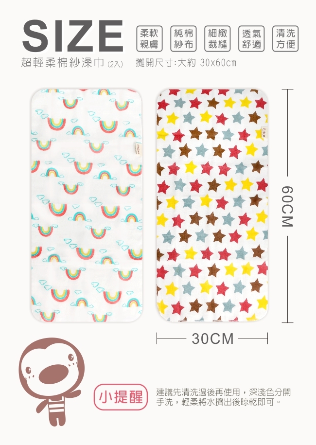 商品品名:超輕柔棉紗澡巾2入-(30*60cm)-(四款)